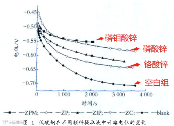 图为低碳钢在不同的防锈颜料提取液中的开路电位变化