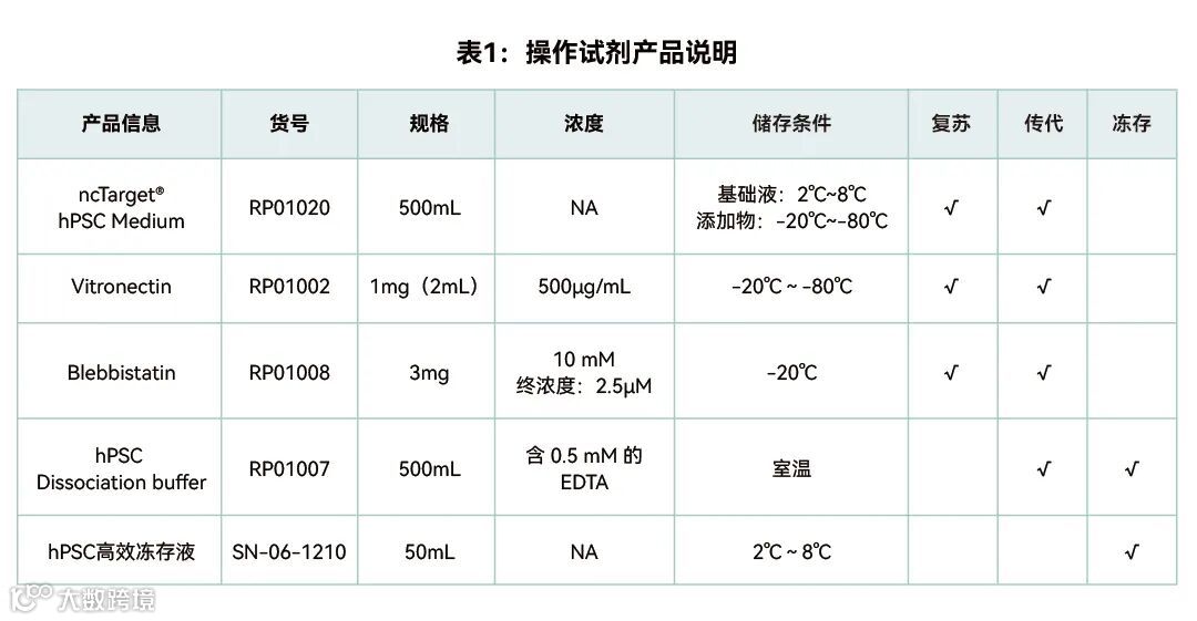 ncTarget® hPSC Medium、Vitronectin、hPSC Dissociation buffer(EDTA传代工作液)、Blebbistatin、hPSC高效冻存液、DMEM/F12培养基、DPBS(不含钙镁)、6孔板、移液管、离心管、冻存管、梯度程序降温盒等。
