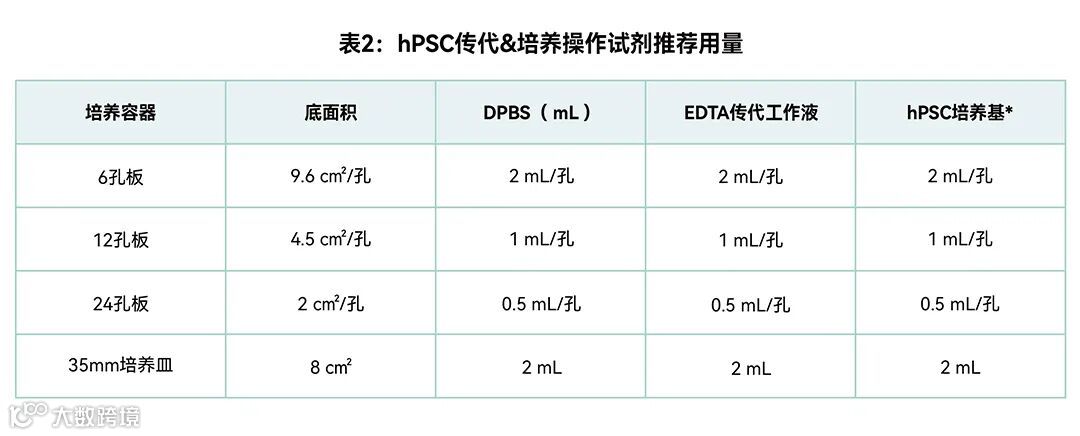 * hPSC常规培养时,当细胞汇合度超过50%,建议换液时可额外添加 50%的培养基;以6孔板为例,换液时每孔可添加3mL的培养基,以此类推。