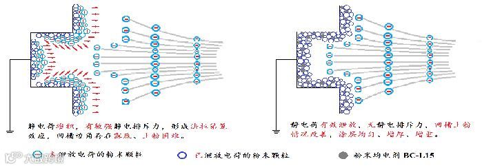 依托无机均电剂 BC-L15本身为无机导电材料,使得快速喷出的或距离静电发生器较远的粉末颗粒充分、快速、均匀带电。