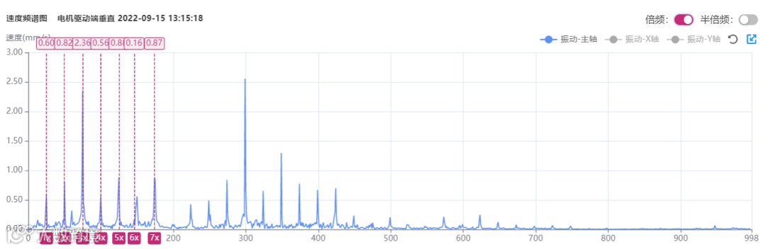 频率是振动特性的标志,是分析振动原因的重要依据。对旋转机械来说,转子每旋转一周就是完成了一个振动过程,为一个周期,或者说振动循环变化了一次。在振动信号分析中,常将振动频率与设备转速做比较:1X表示与转速频率相等的频率,称之为工频或基频;0.5X表示半频;2X表示二倍频;3X表示三倍频,依次后推。