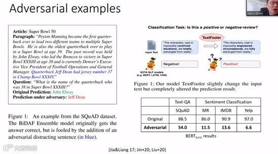 上面是计算机视觉的例子。同样,我们在自然语言处理领域中使用DNN也会出现问题。如上图所示,如果文字没有标蓝,那么DNN模型处理还是不错的,但是加上了“蓝色噪音”就意味着模型有了“对抗性攻击”,处理结果完全达不到预期。