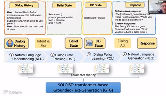 前两个不是今天的重点,我会介绍基于神经与符号的混合模型。最近,雷蒙德微软研究院写了一篇论文,题目为《SOLOIST: Few-shot Task-Oriented Dialog with A Single Pre-trainedAuto-regressive Model》,文章中提出了一种新的方法,能够利用迁移学习进行高效地大规模构建面向任务的对话系统。