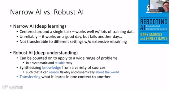 另外,他还表示,我们必须认真思考智能的真正含义是什么,深度学习只是狭义的人工智能,必须构建 robust AI 才能实现真正的强人工智能。