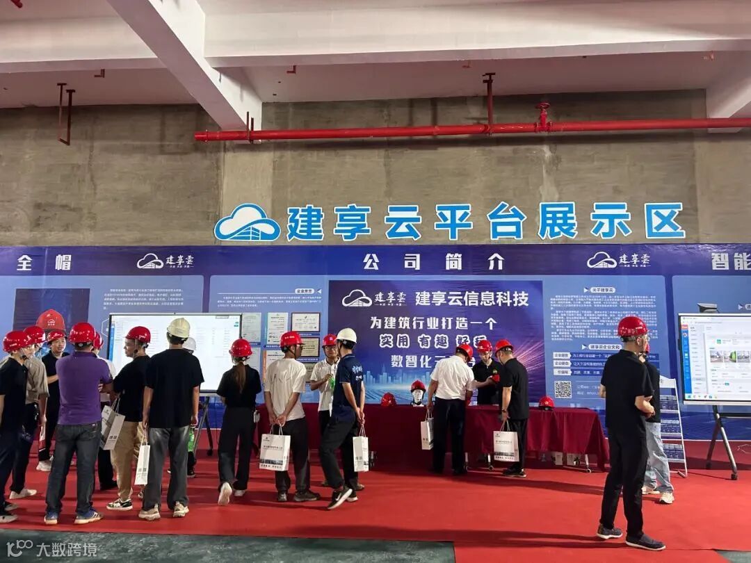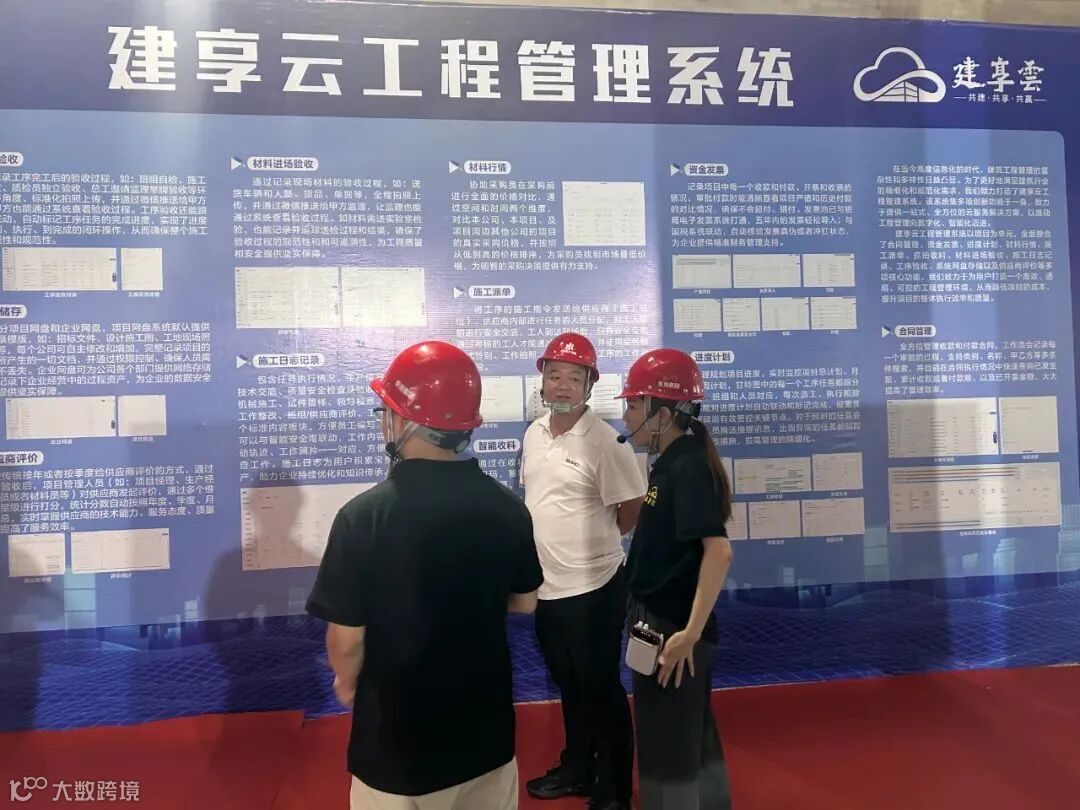 观摩现场,展示了建享云工程管理系统高效管理、智能安全帽的实时防护、智能抓拍收料的精准验收、项目物资管理的精细化管理,和AI智能聊天机器人的即时支持等多项前沿技术。
