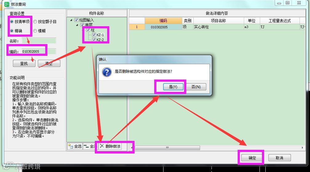 这个我们举个例子吧,比如柱子KZ-1套错了做法,已经用做法刷复制到KZ-2中,我们可以在柱定义界面,点做法查询,有按清单项查询和按定额字目查询,如我们按清单项精确查找,在编码处输入要删除的清单编码010302005,点查找,勾选要删除的构件,点删除做法即可。如图: