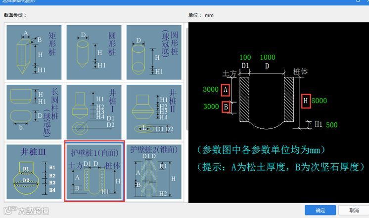 1、护壁桩1(直面)里的A,B,H分别是什么,有什么关系?