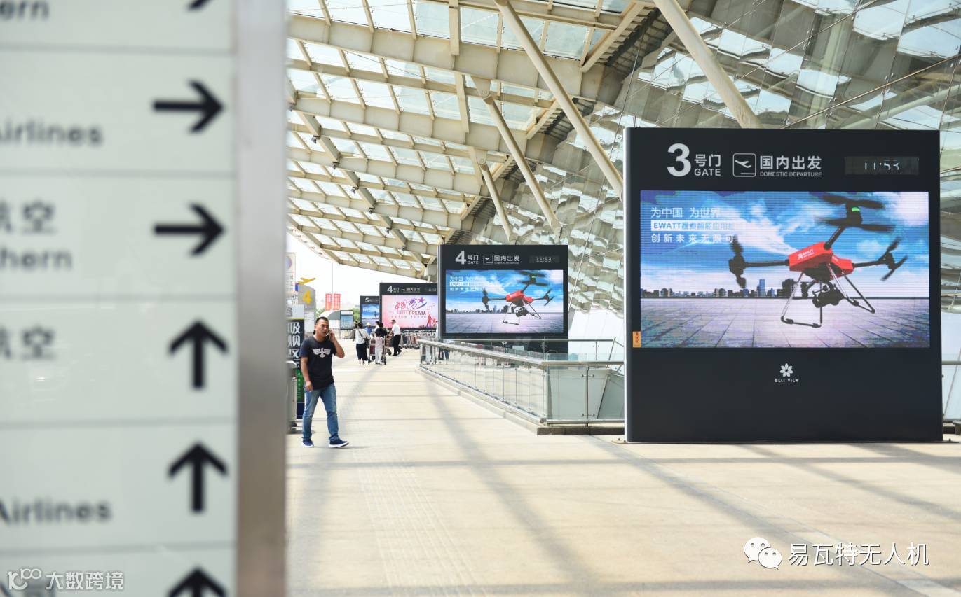 平日的天河机场一如既往的行色匆匆。但这几天的机场有点不一样——满街的广告牌被抢眼的蓝色科技感画面“侵占”了。