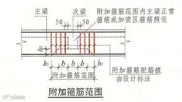 附加箍筋在平法16G101-1中的88页有说明附加箍筋是在主梁与次梁相交的位置布置的箍筋,具体附加箍筋的配筋值是由设计给出的,然而,次梁加筋也是在主梁与次梁相交的位置布置的,它是软件中的一个名词,其实是一个概念,都是在梁两侧增加的箍筋,如图所示: