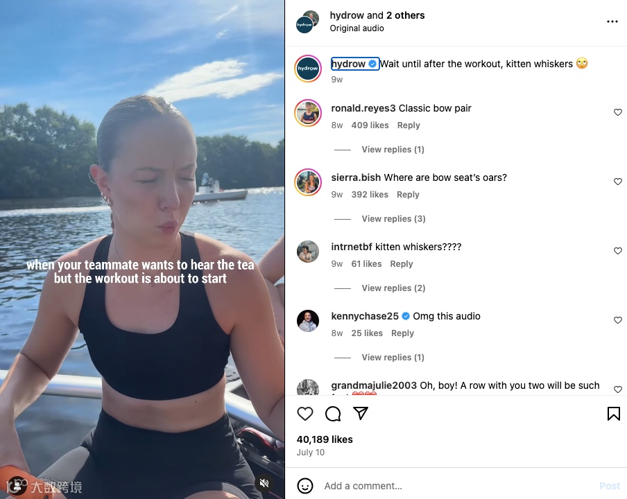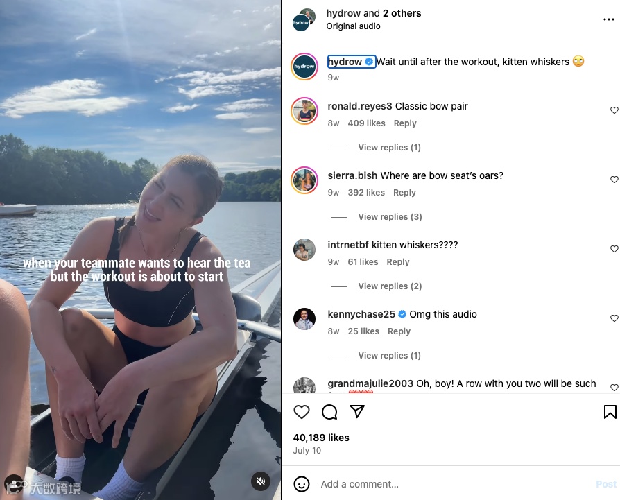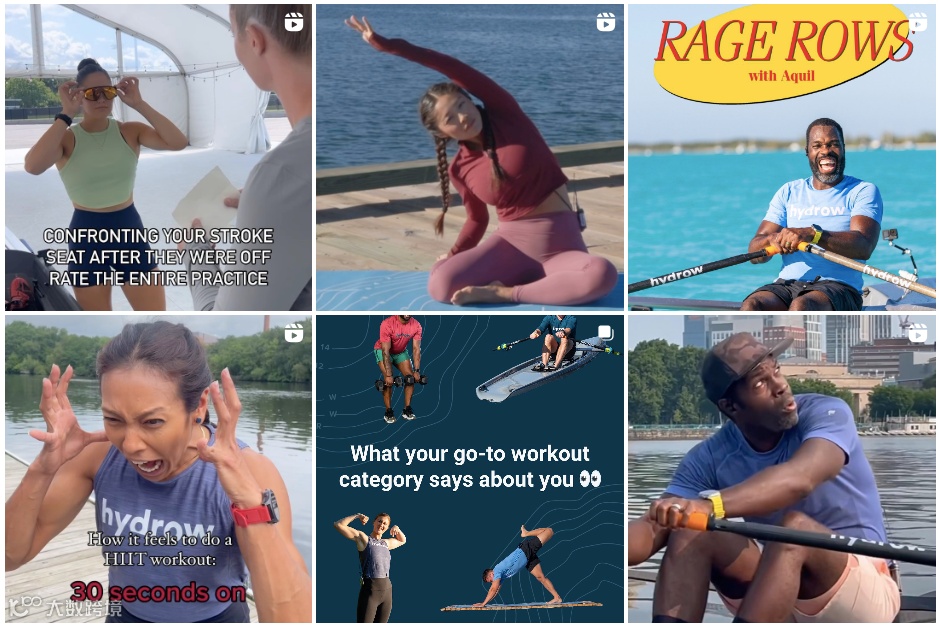 其Instagram目前有9万粉丝,发布的内容并非以产品为主,而是围绕划船运动员、爱好者,包括日常划船训练、划船技巧、健身生活、划船相关的搞笑内容、运动比赛等,聚焦划船带来的积极生活影响。