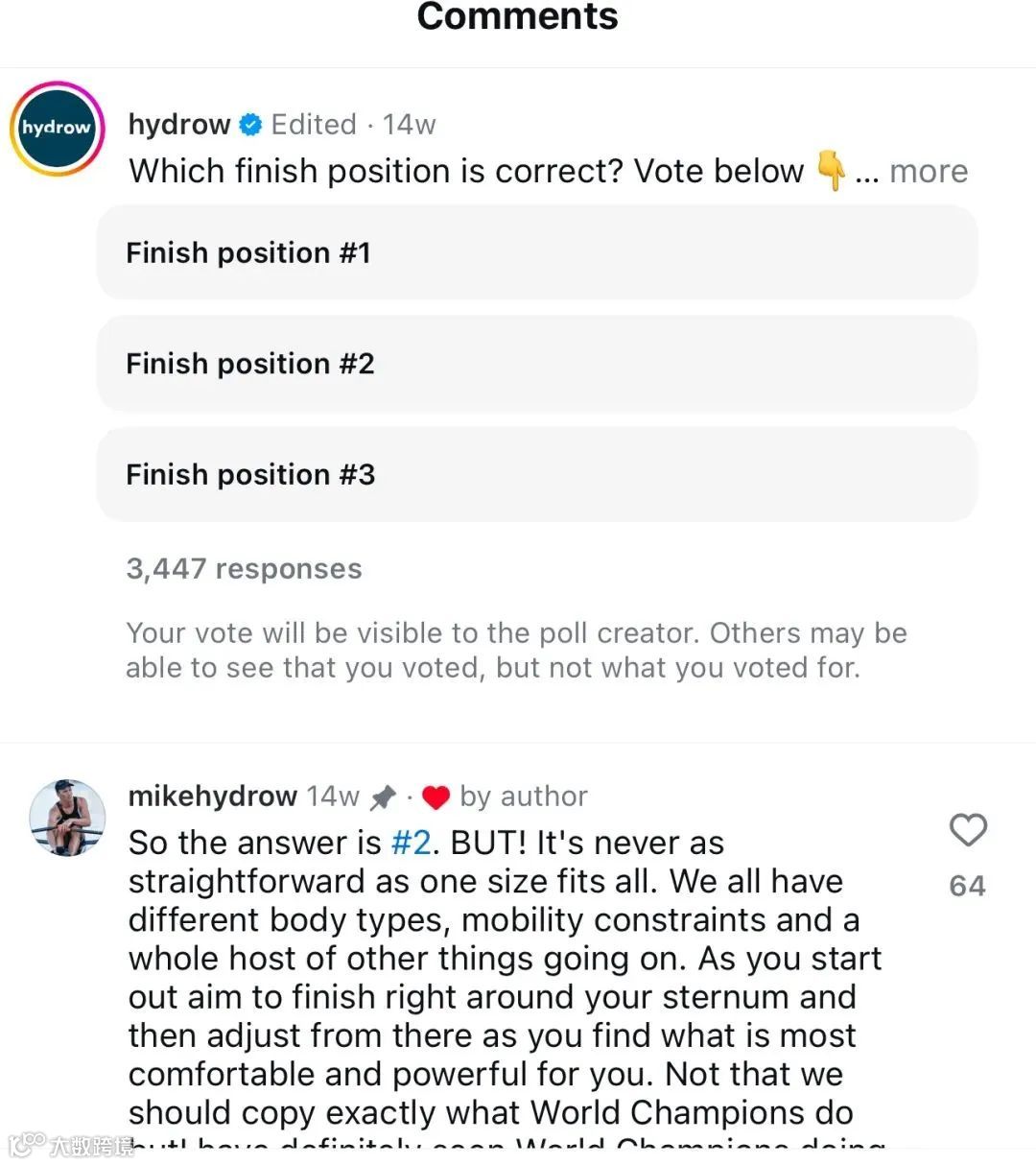 Mike发布的品牌相关视频中,最常见的就是划船技巧类的教学视频。在最近一条视频中,Mike示范了3种不同的划船姿势,品牌在评论区发起互动,让粉丝评论哪个动作是正确的。