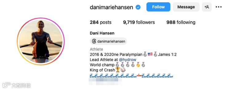 mac evans和Dani Hansen都是Hydrow的品牌运动员,两人私下互动也很多。Dani Hansen不仅是2016年和2020年的残奥会运动员,还曾经获得银牌,在Instagram上虽然粉丝不多,但是专业性强,能为品牌带来可靠的信任背书,粉丝对她的认可度很高。mac evans则有超过1.6w的粉丝,作为划船运动员,她的个性活泼,很有感染力,社交媒体上的粉丝与她的互动活跃。