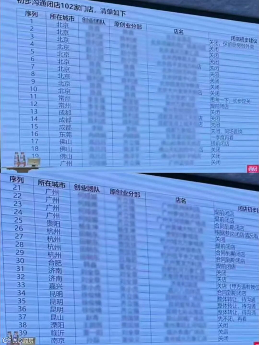 博主发布的PPT页面标题为:“初步沟通闭店102家门店,清单如下”。红星资本局梳理发现,拟关门店覆盖范围较广:上海19家、北京10家、广州5家、杭州4家,另有深圳、苏州等地门店在列。