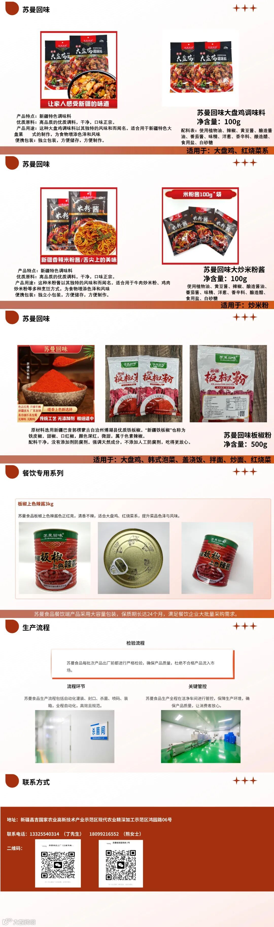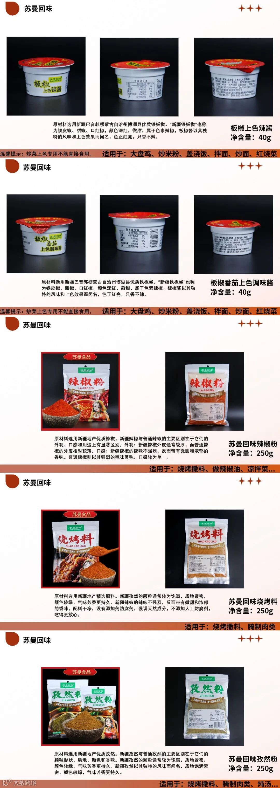 依托新疆优质辣椒资源,苏曼食品研发推出系列具有地域特色的调味品,包括:板椒上色辣酱、板椒番茄上色调味酱、米粉酱、大盘鸡调味料、孜然粉、辣椒面、烧烤料等。