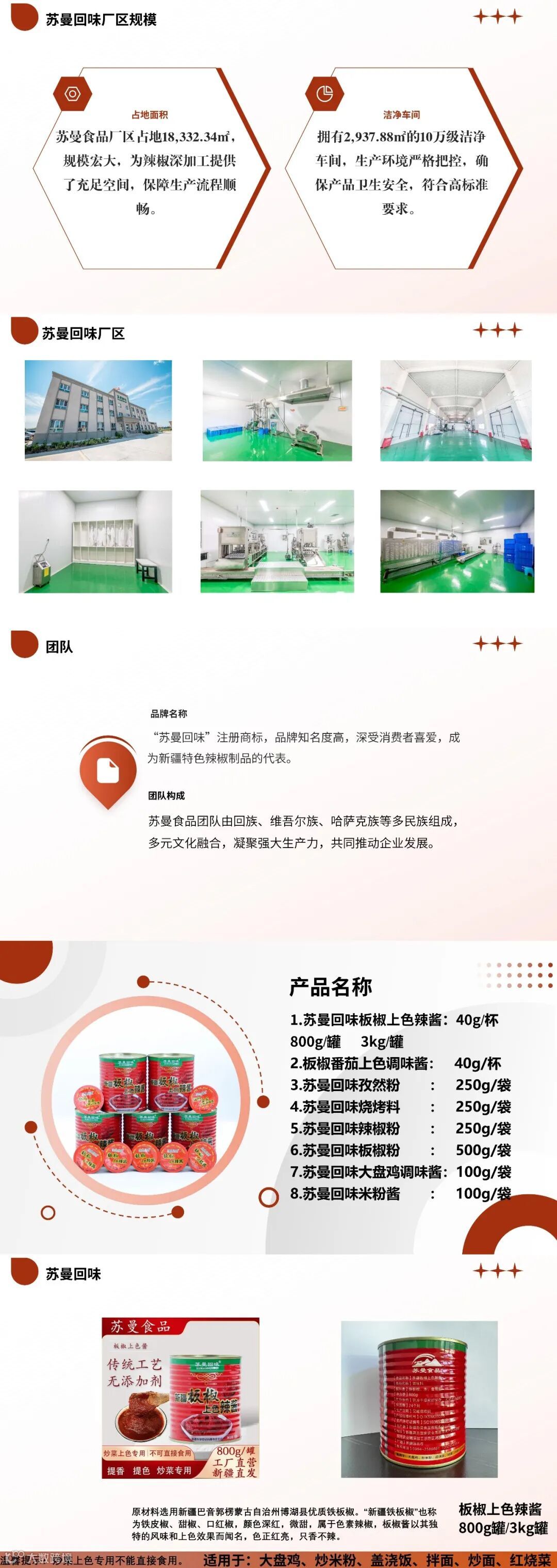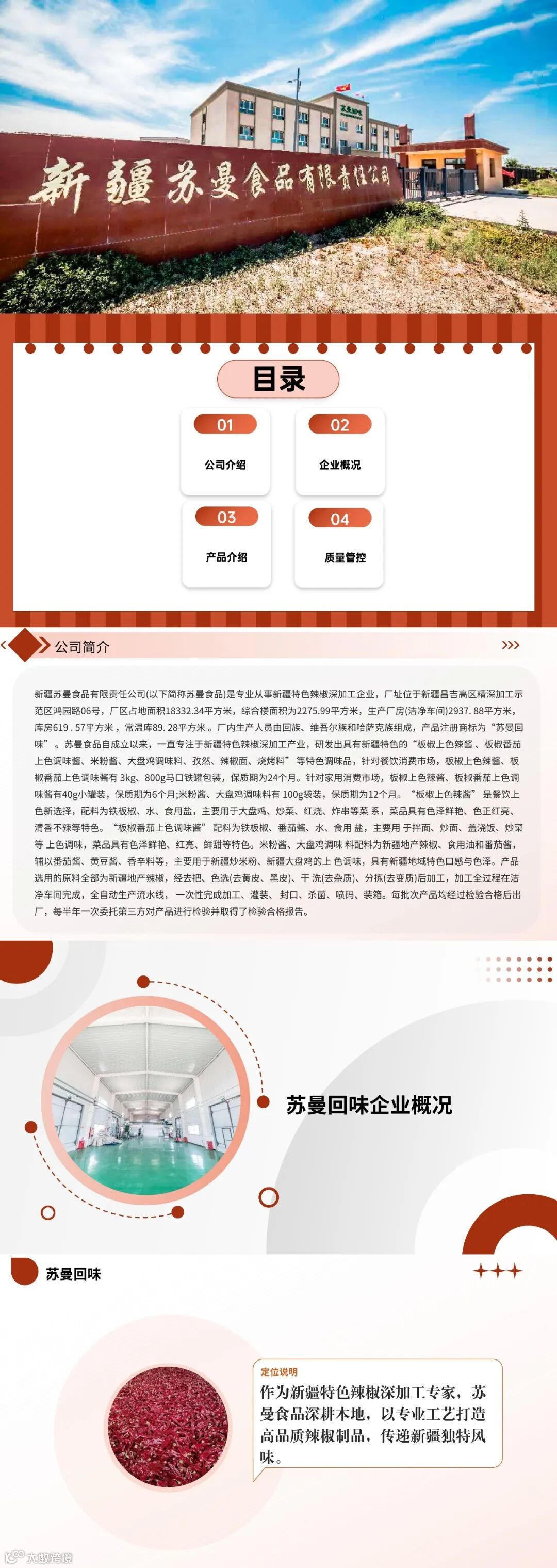新疆苏曼食品有限责任公司(简称“苏曼食品”)是一家专注新疆特色辣椒深加工的企业,位于新疆昌吉高新技术产业开发区精深加工示范区鸿园路06号。厂区占地18332.34平方米,建有综合楼2275.99平方米、洁净生产车间2937.88平方米、常温及普通库房合计708.85平方米。生产团队由回族、维吾尔族、哈萨克族员工组成,注册商标为“苏曼回味”。