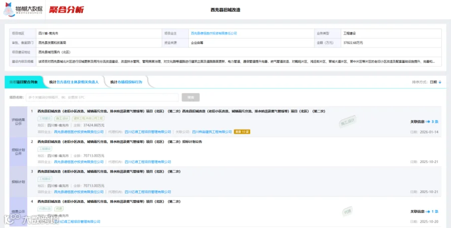 如需查看项目的施工、勘察设计、监理等全流程信息,请点击右侧「聚合分析」。该功能基于大数据智能检索技术,可自动关联项目的各标段数据,为您呈现完整的项目全景及相关资料。
