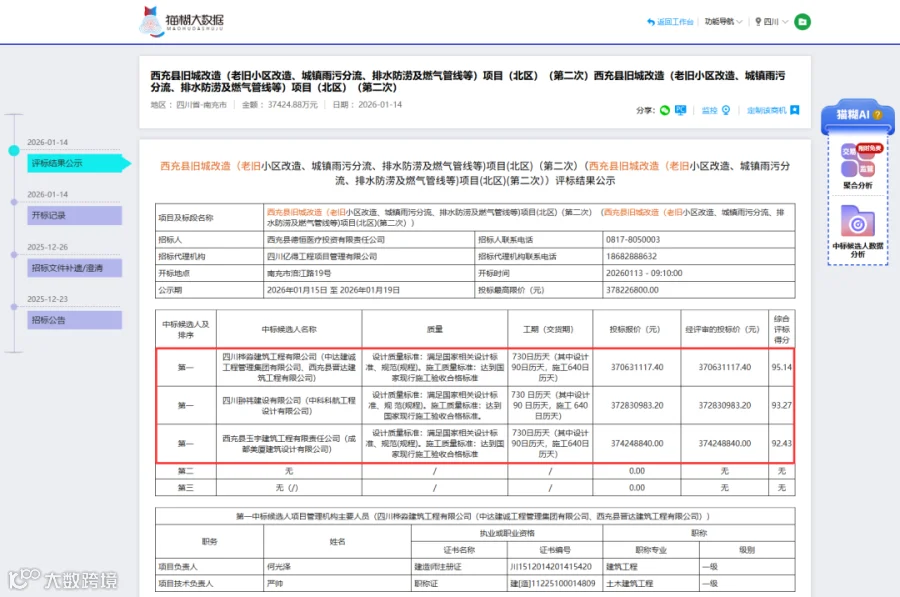 该项目于1月13日正式开标,共有4家投标人参与竞标。项目设定的最高限价为3.7822亿元。本项目采用评定分离机制确定中标人,1月14日完成评标工作,确认以下三家投标企业为中标候选人: