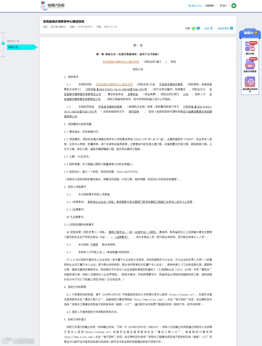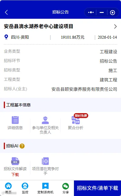 1月14日,安岳县滴水湖养老中心建设项目已由安岳县发展和改革局批准建设,项目业主为安岳县颐安康养服务有限责任公司,建设资金全部来自自筹资金,现已具备招标条件并通过委托招标的形式进行公开招标。