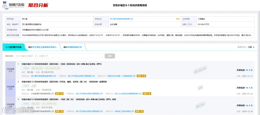 如需查看项目的施工、勘察设计、监理等全流程信息,请点击右侧「聚合分析」。该功能基于大数据智能检索技术,可自动关联项目的各标段数据,为您呈现完整的项目全景及相关资料。