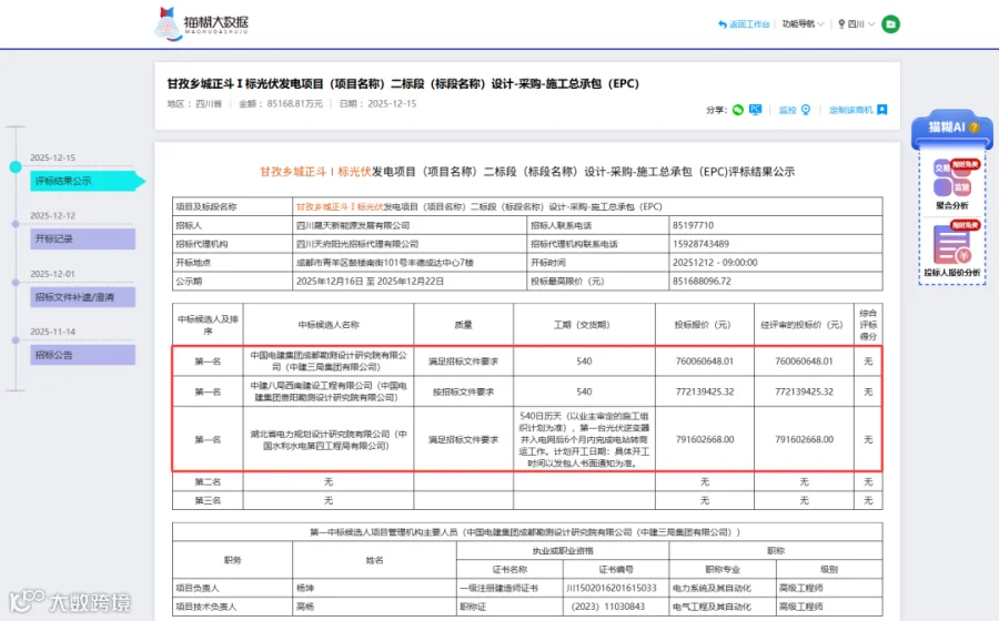 该项目于2025年12月12日正式开标,共有15家投标人参与竞标。项目设定的最高限价为8.5168亿元。本项目采用评定分离机制确定中标人,2025年12月15日完成评标工作,确认以下三家投标企业为中标候选人: