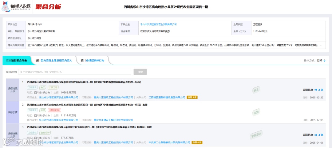 如需查看项目的施工、勘察设计、监理等全流程信息,请点击右侧「聚合分析」。该功能基于大数据智能检索技术,可自动关联项目的各标段数据,为您呈现完整的项目全景及相关资料。