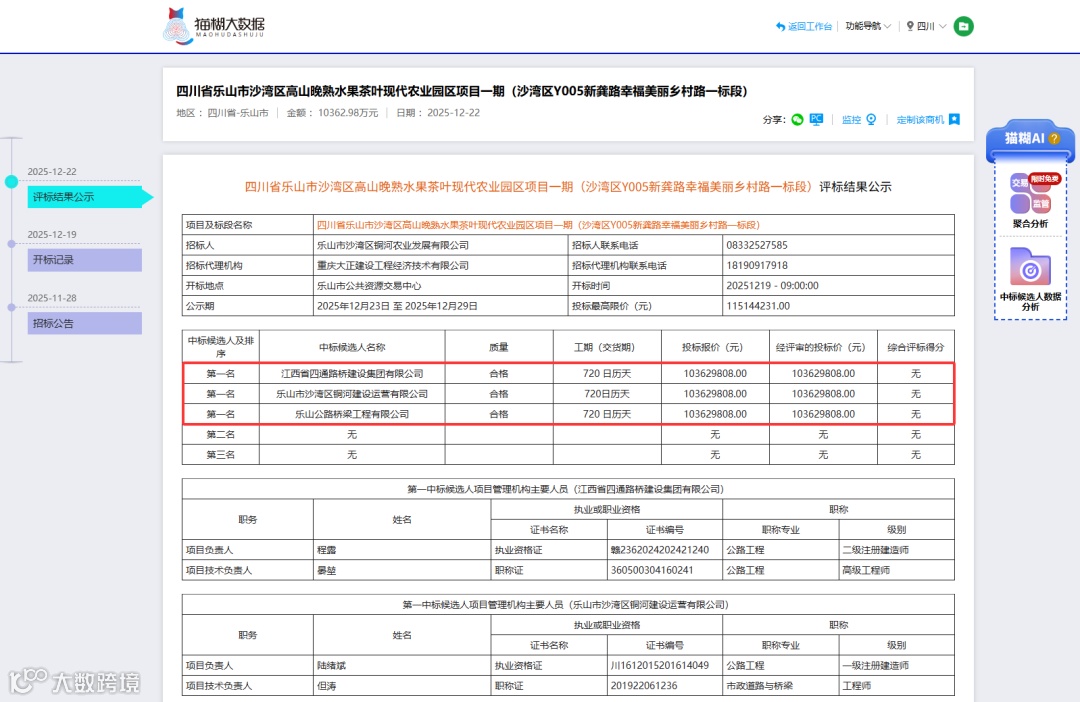 该项目于12月19日正式开标,共有5家投标人参与竞标。项目设定的最高限价为1.1514亿元。本项目采用评定分离机制确定中标人,12月22日完成评标工作,确认以下三家投标企业为中标候选人: