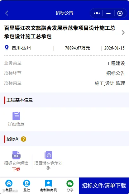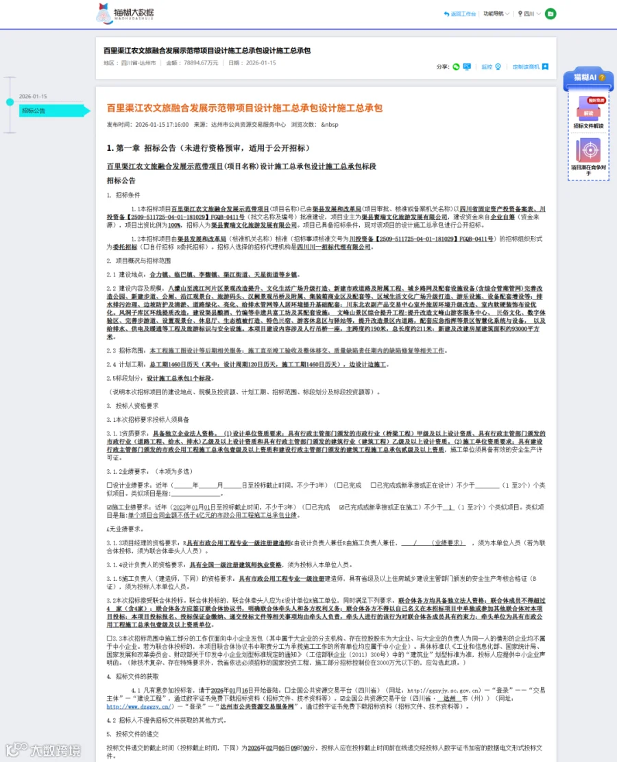 1月15日,百里渠江农文旅融合发展示范带项目设计施工总承包已由渠县发展和改革局批准建设,项目业主为渠县賨瑞文化旅游发展有限公司,资金全部来自企业自筹,现已具备招标条件并通过委托招标的形式进行公开招标。本项目采用中标候选人评定分离机制确定中标人。