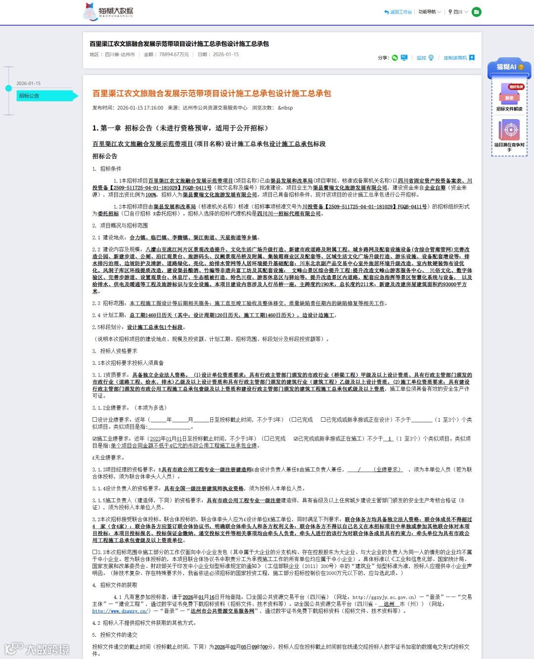 本次投标截止时间为2026年02月05日09时00分,请务必在截止时间之前完成投标文件的上传。如果您希望获取更多关于该项目的详细信息,可以通过“猫糊”平台下载“招标文件”,查看更详细的项目内容。