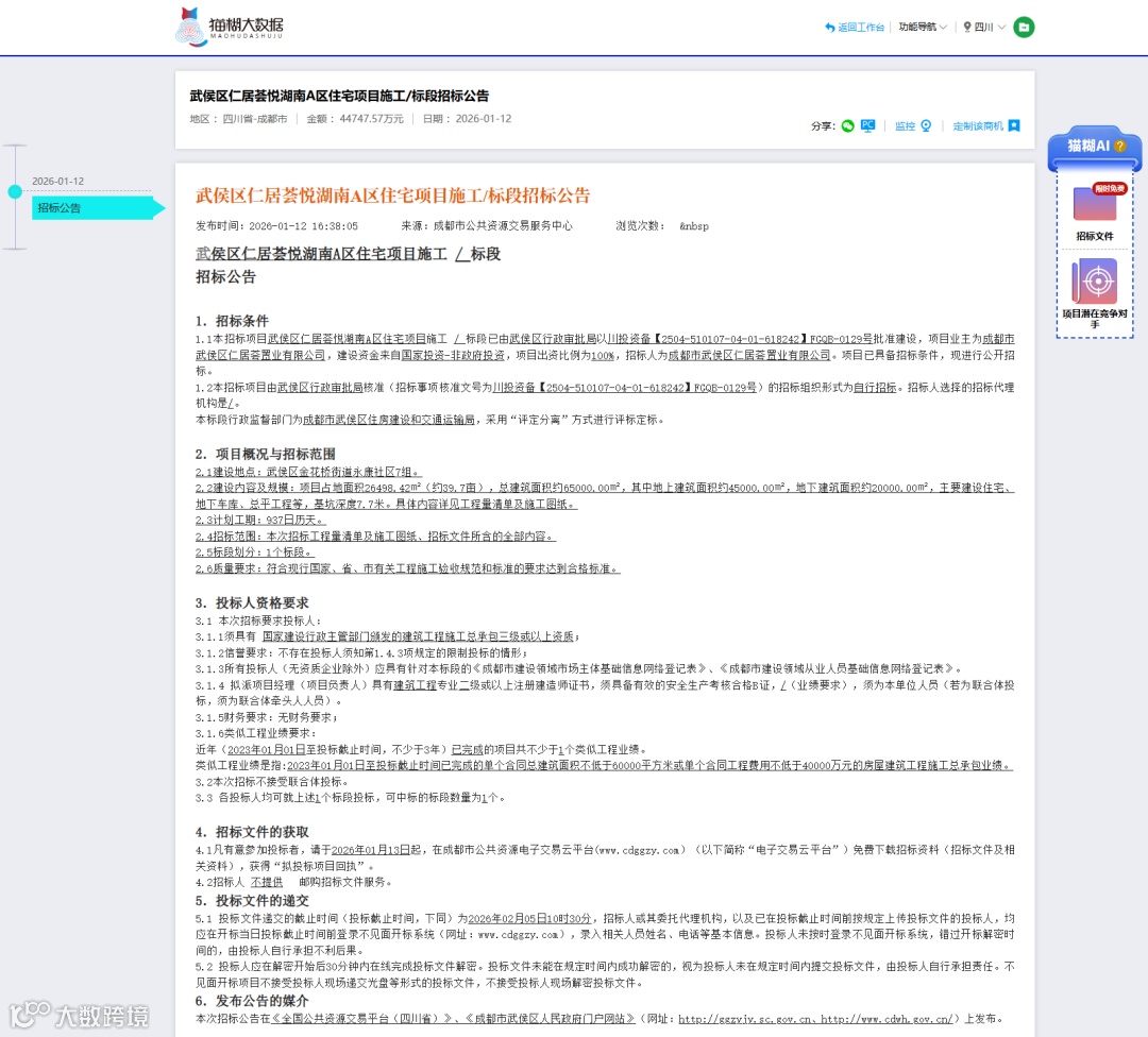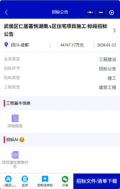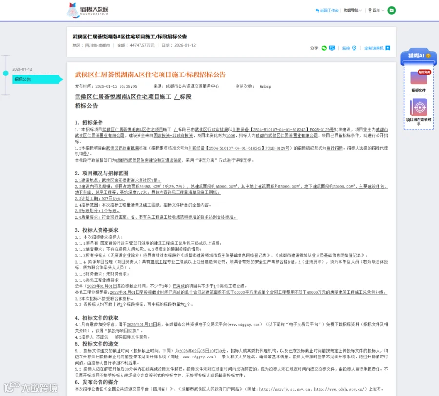1月12日,武侯区仁居荟悦湖南A区住宅项目施工标段已由武侯区行政审批局批准建设,项目业主为成都市武侯区仁居荟置业有限公司,资金全部来自国家投资-非政府投资,现已具备招标条件并通过自行招标的形式进行公开招标。本标段行政监督部门是成都市武侯区住房建设和交通运输局,评标定标采用“评定分离”方式。
