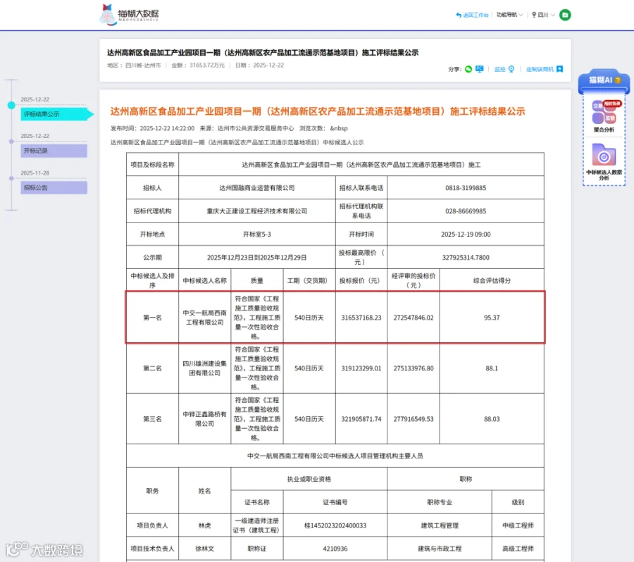 该项目于2025年12月19日正式开标,共有7家投标人参与竞标,项目设定的最高限价为3.2792亿元。经过评审,中交一航局西南工程有限公司以3.1653亿元的报价成功中标。整个施工工期为540个日历天。