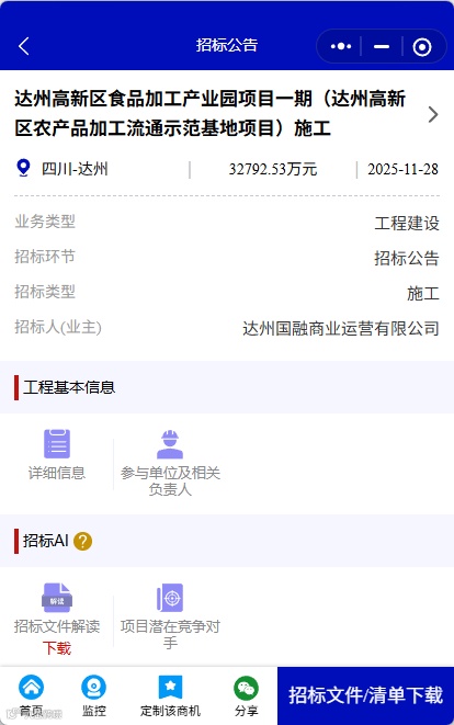 11月28日,达州高新区食品加工产业园项目一期(达州高新区农产品加工流通示范基地项目)施工已由达州市发展和改革委员会批准建设,项目业主为达州国融商业运营有限公司,资金全部来自地方财政性资金及企业自筹等多渠道筹集,现已具备招标条件并通过委托招标的形式进行公开招标。