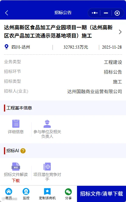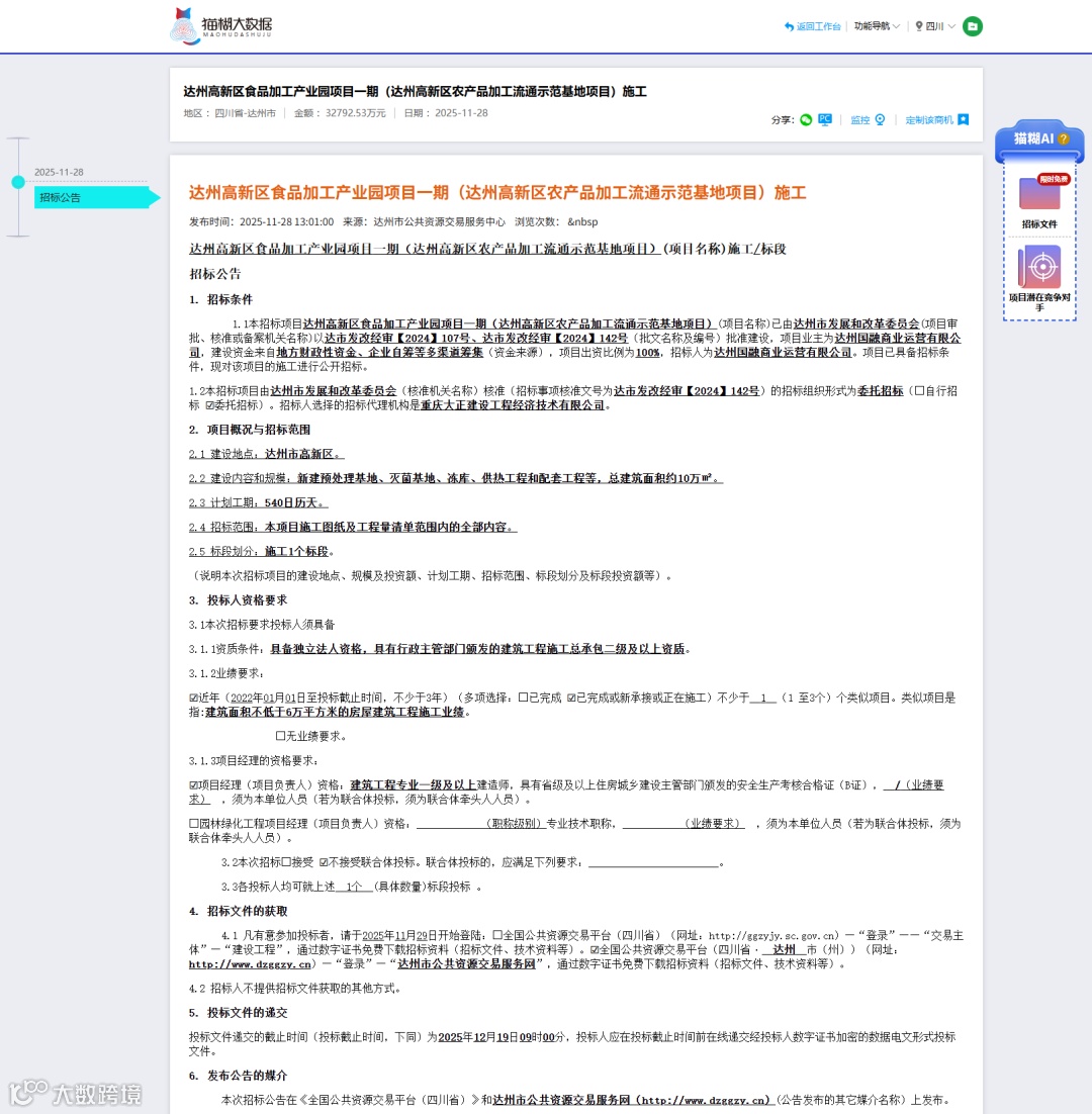该项目位于四川省达州市高新区,总建筑面积约10万平方米,新建预处理基地、灭菌基地、冻库、供热工程和配套工程等。项目招标控制价为3.2792亿元,计划工期为540日历天。