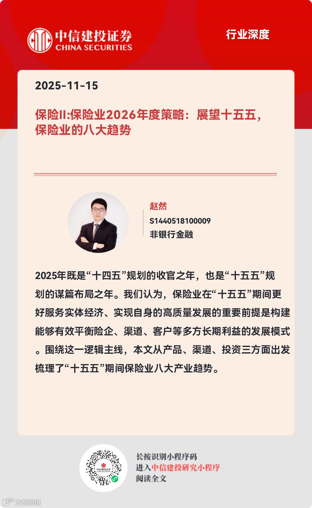 2025年既是“十四五”规划的收官之年,也是“十五五”规划的谋篇布局之年。我们认为,保险业在“十五五”期间更好服务实体经济、实现自身的高质量发展的重要前提是构建能够有效平衡险企、渠道、客户等多方长期利益的发展模式。围绕这一逻辑主线,本文从产品、渠道、投资三方面出发梳理了“十五五”期间保险业八大产业趋势: