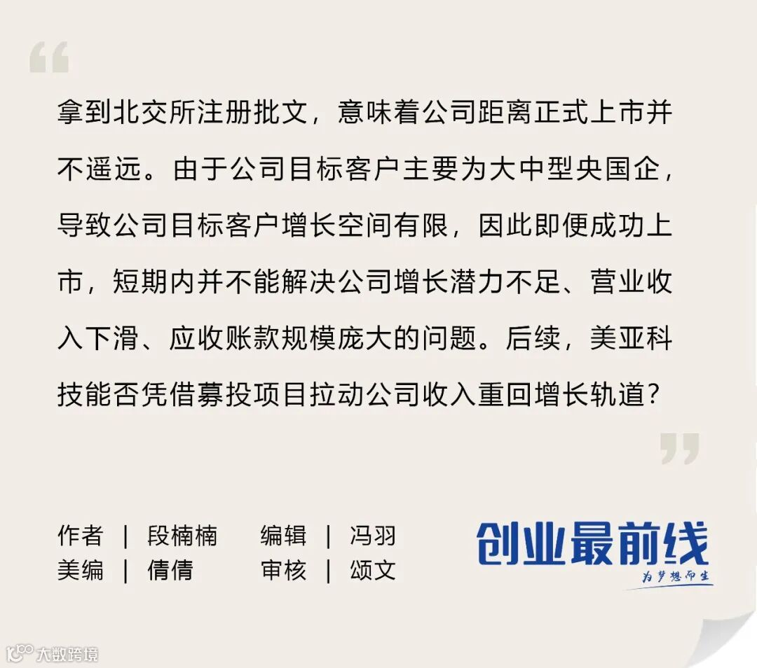 拿到北交所注册批文,意味着公司距离正式上市并不遥远。由于公司目标客户主要为大中型央国企,公司目标客户增长空间有限,因此即便成功上市,短期内并不能解决公司增长潜力不足、营业收入下滑、应收账款规模庞大的问题。后续,美亚科技能否凭借募投项目拉动公司收入重回增长轨道,「创业最前线」将持续保持关注。
