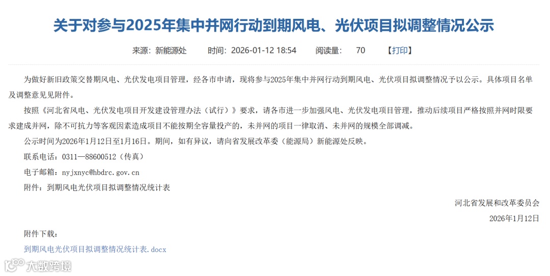 2025年以来,河北多次公布风、光项目调整情况。12月23日,河北发改委公示2025年风电、光伏发电项目拟调整情况,涉及风、光项目规模总计53.67GW。