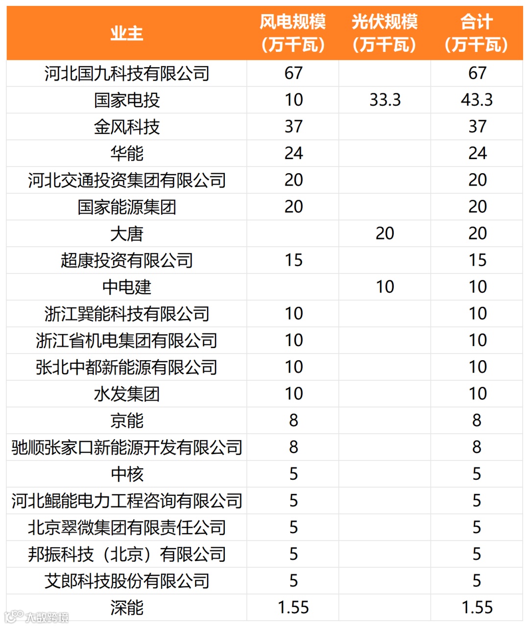 从业主情况来看,河北国九科技有限公司被调整规模最多,共670MW;国家电投其次,共433MW;金风科技、华能、河北交通投资集团、国家能源集团、大唐被调整规模也超过了200MW。