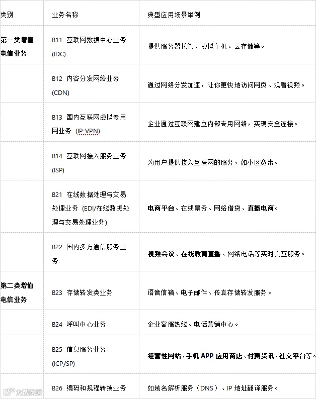 根据《电信业务分类目录》,增值电信业务主要分为“第一类”和“第二类”,涵盖了我们熟知的许多互联网业务。