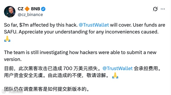 CZ表示会对TrustWallet所有被盗用户进行全额赔付。