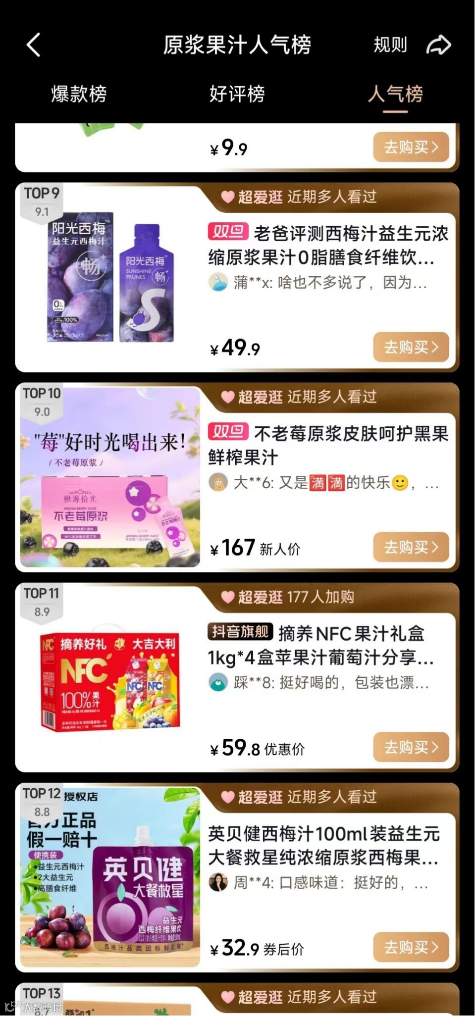 翻看抖音原浆果汁人气榜,英贝健上榜的依旧是西梅汁产品,在抖音原浆果汁人气榜第12名。