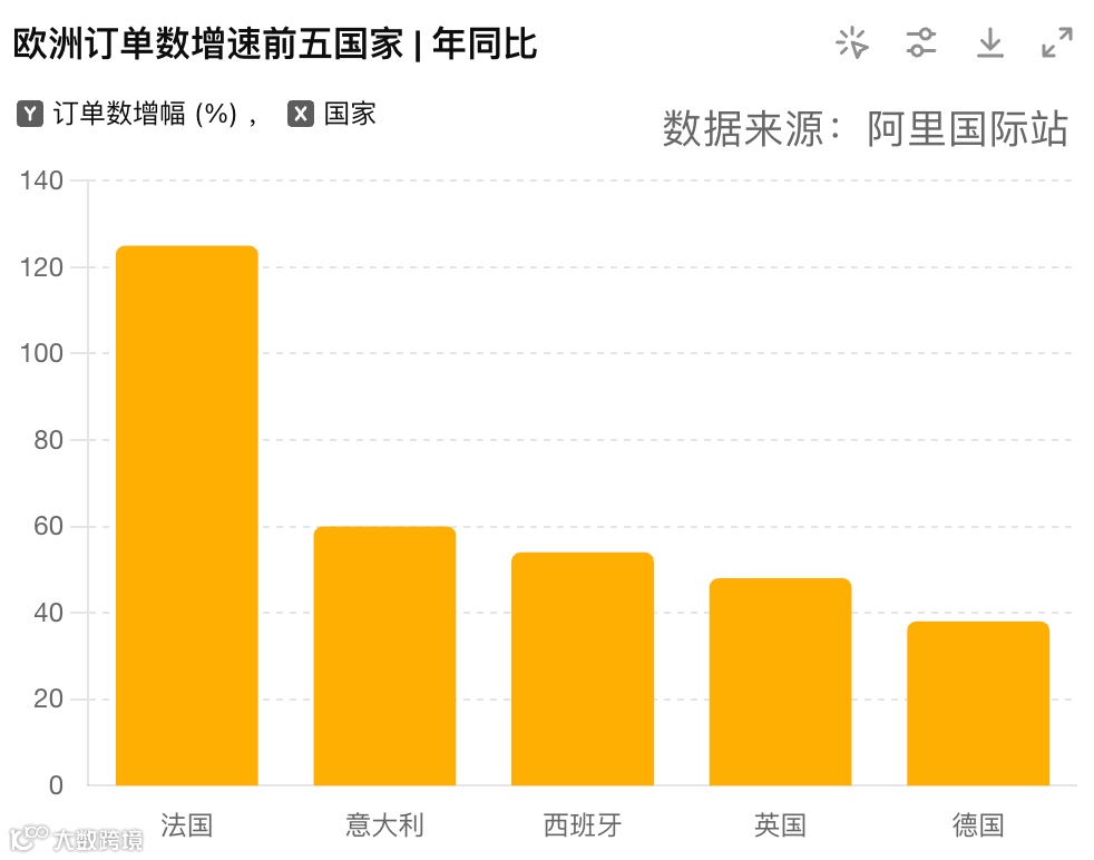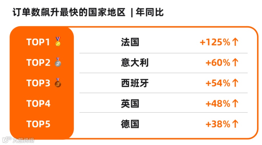 具体而言,欧洲整体订单量、GMV、支付买家数年同比增长超45%,其中法国增长超125%、意大利超60%、西班牙超54%、英国超48%、德国超38%。