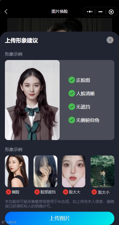 打开“AI换脸视频照片神器”→上传模版照片→再上传正脸照片→