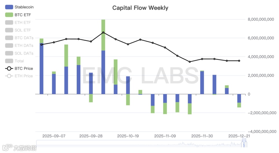 自11月21日触底以来,资金逐步显示转正流入,本周开始转为流出,且为稳定币通道和ETF通道同步流出,这是BTC价格二次下探且反弹乏力的根本原因,也意味着抛售并未大幅衰减,但买力却在丢失。宏观风险解除之后,下周买力能否回归殊为关键。