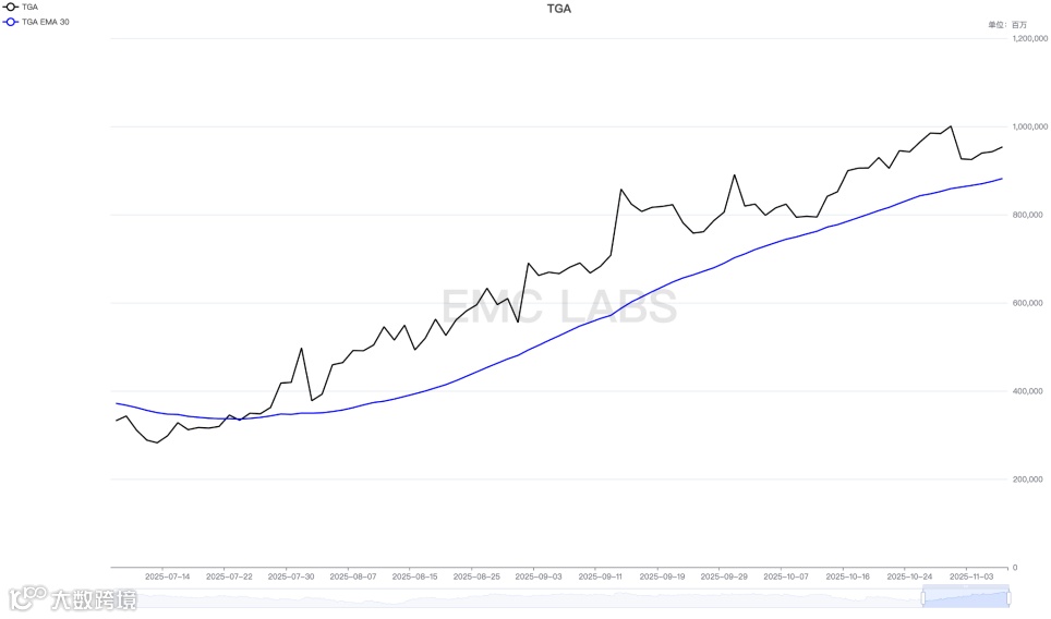 这期间,因为美国政府停摆,支出难于进行,美联储TGA账户余额不断创下历史新高。