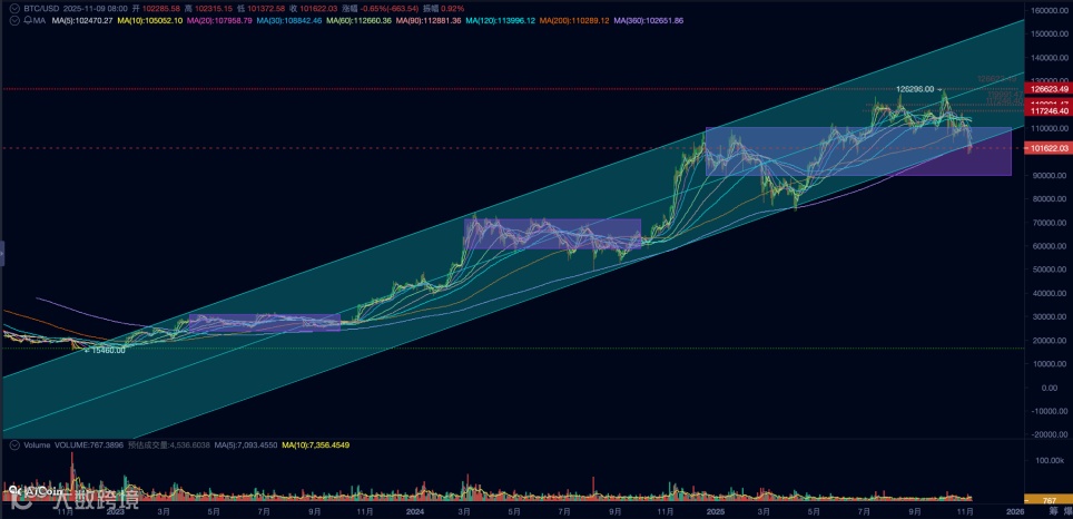技术上而言,本周二暴力下跌时跌破10万美元关口,剩余大部分时间均围绕这一价格波动,这一价格也是360日均价。这一价格亦是我们长期监测的本轮牛市上升通道的下沿,如果有效跌破这一价格,技术上本轮BTC牛市便正式告结。