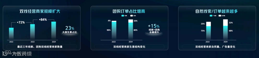 根据巨量引擎提供的数据,2024年上半年在抖音同时做团购与线索营销的商家数量同比去年增长了84%;同时这部分双线经营的商家,自然流量占比也从2023年的25%,提升到了2024年的32%,这让他们的利润空间更大,生意越做越健康。