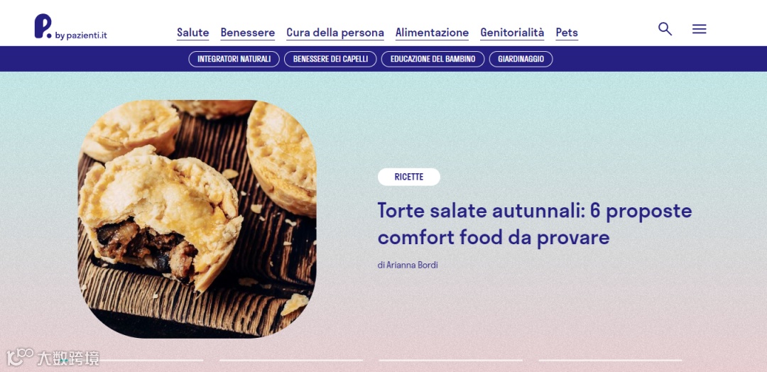 Pazienti.it成立于2010年,是致力于全面健康和福祉的数字平台,旨在提供权威的内容、信息和服务。该网站与万名专家合作,拥有超过200万名用户和全网社媒24万粉丝。网站内容由五大板块组成,其中以烹饪,健康和生活方式为主。