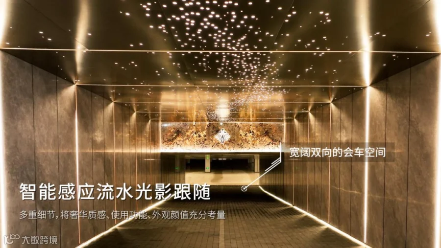 ·入口坡道采用 “星光大道” 动态光效设计,车辆驶入时两侧竖向灯带逐级点亮,与星空顶光效联动,营造充满仪式感的归家前奏。