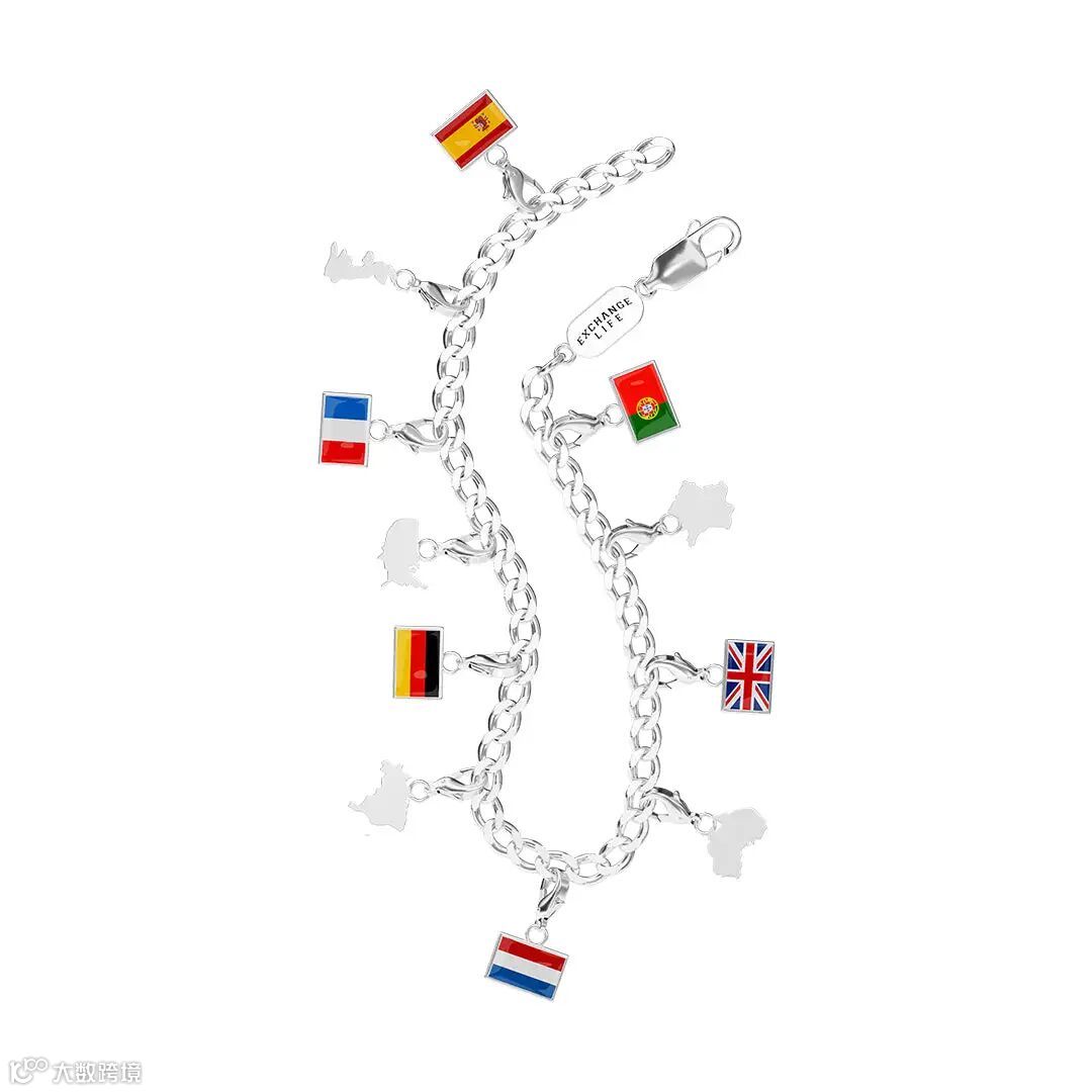 它的产品其实是半定制模式:提供一些简约百搭的手链做基础,再搭配不同国家的国旗和地图形状的小吊坠,供用户自由搭配佩戴。