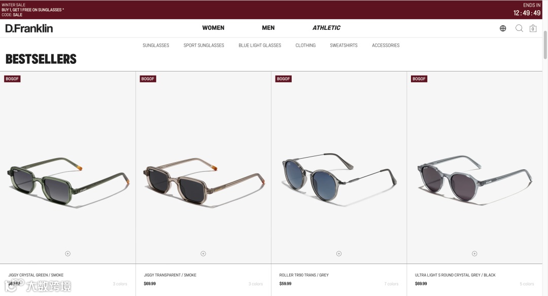 D.Franklin独立站热销榜上的产品主要是墨镜,价位在$60-70区间。目前都在做买一送一的促销活动,页面顶部还悬挂着实时变动的活动结束倒计时。