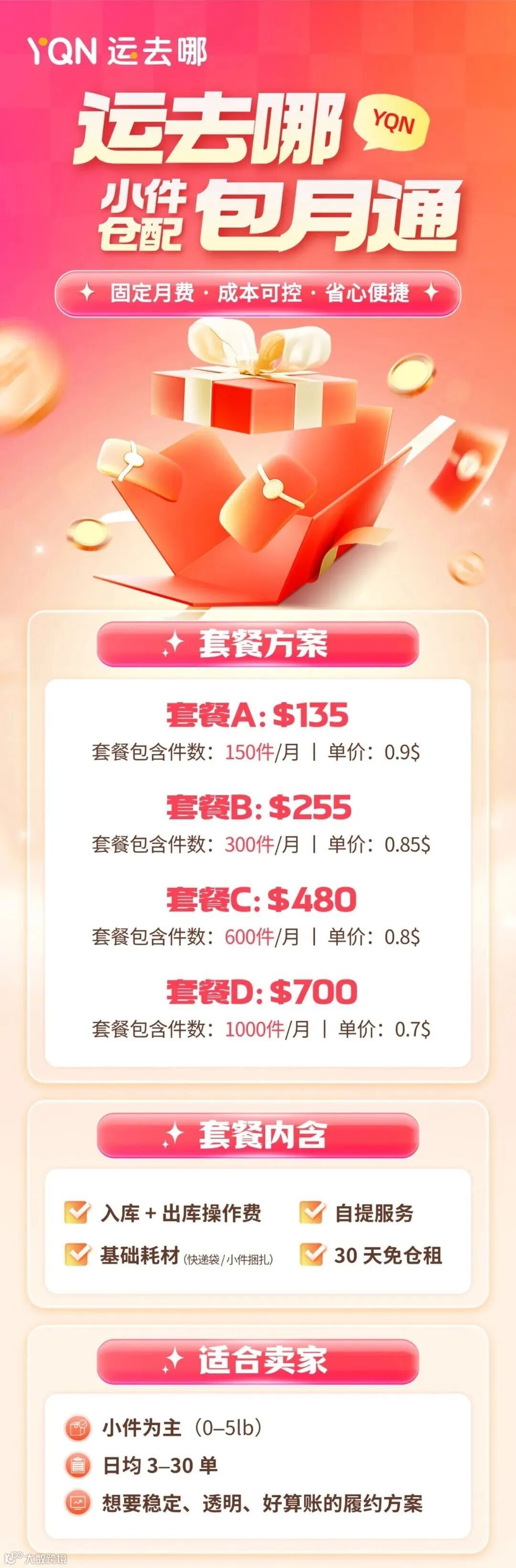 针对小件、轻货及初入北美市场的卖家,运去哪推出“小件仓配包月套餐”,将复杂费用整合为固定资费方案,如同手机套餐般简洁透明。